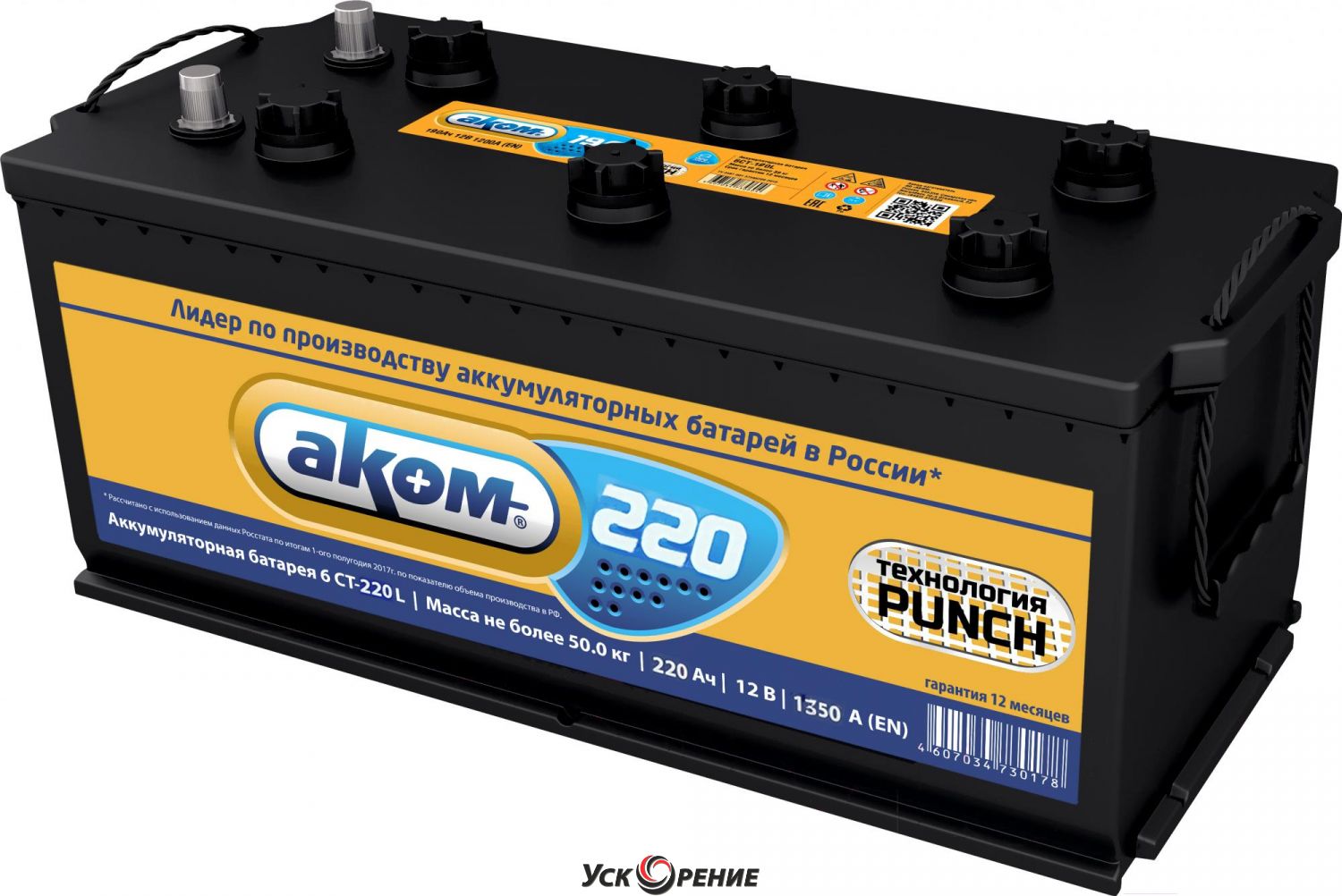 Описание Автомобильный аккумулятор AKOM 6CT-220L 4 (220 А/ч); Напряжение: 12V; Емкость: 220 А·ч; Пусковой ток A (EN): 1350 А; Полярность: прямая