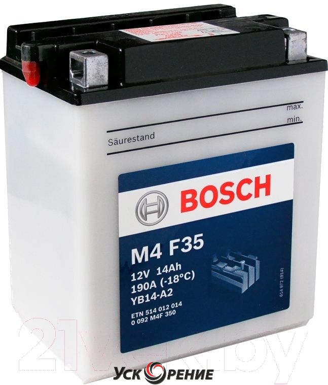 Описание Мотоаккумулятор Bosch M4F YB14-A2 / 0092M4F350 (14А/ч); Напряжение: 12V; Емкость: 14 А·ч; Пусковой ток A (EN): 140 А; Полярность: прямая