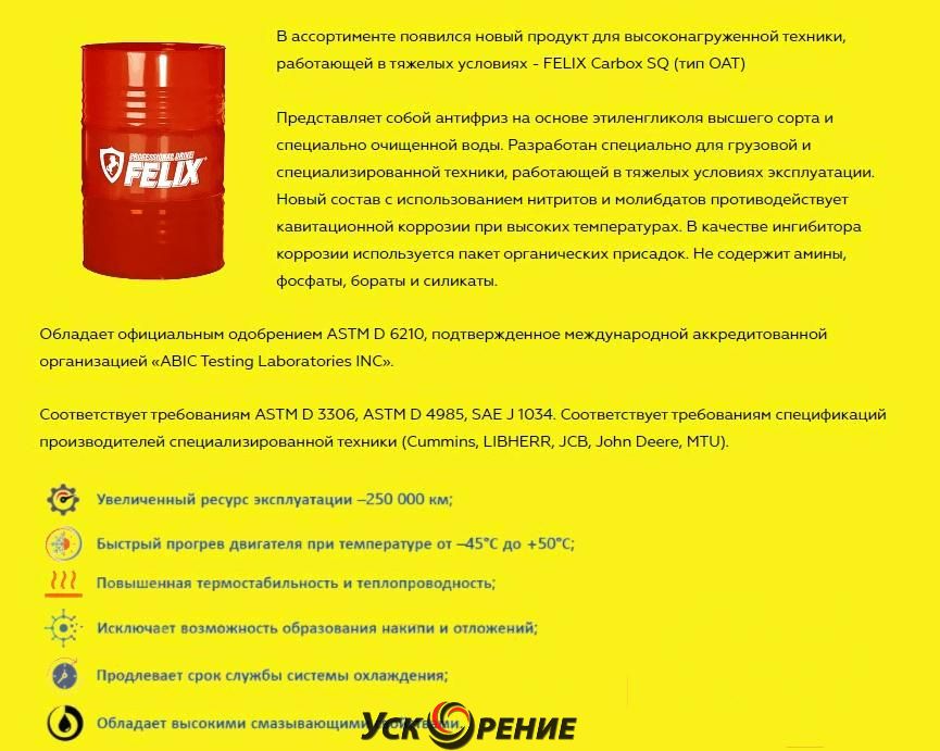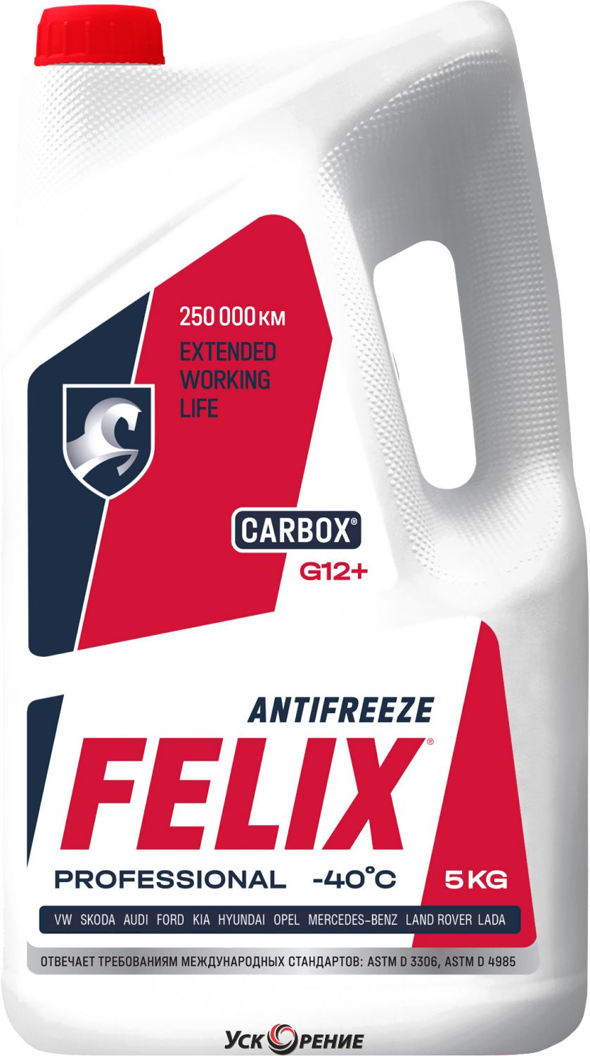Описание Антифриз FELIX Carbox G12+ до -40°С / 430206033 (5кг, красный); Классификация антифриза по VAG: G12+; Цвет: красный; Область применения: система охлаждения двигателя; Вес: 5 кг