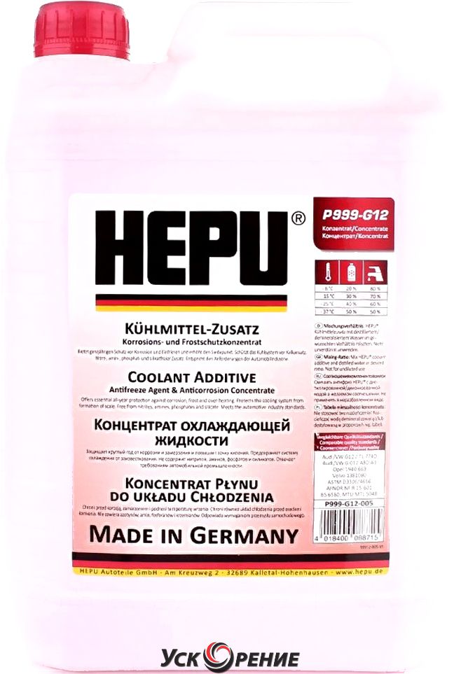 Описание Антифриз Hepu G12 / P999-G12-005 (5л); Классификация антифриза по VAG: G12; Цвет: красный; Область применения: система охлаждения двигателя; Объем: 5 л