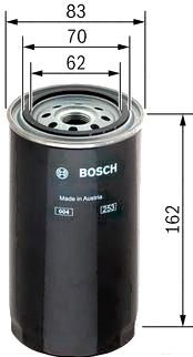 Описание Топливный фильтр Bosch F026402002; Исполнение фильтра: накручиваемый; Диаметр корпуса: 83 мм; Высота: 162 мм