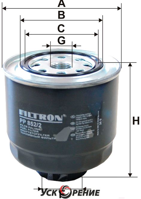 Описание Топливный фильтр Filtron PP852/2; Исполнение фильтра: накручиваемый; Диаметр корпуса: 107 мм; Высота: 104 мм; Резьба: M20x1.5