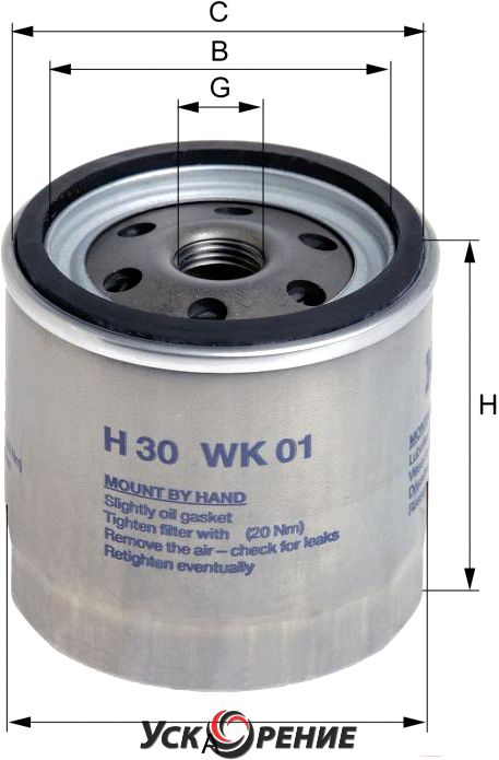 Описание Топливный фильтр Hengst H30WK01; Исполнение фильтра: накручиваемый; Диаметр корпуса: 76 мм; Высота: 80.5 мм; Резьба: M16x1.5