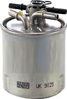Описание Топливный фильтр Mann-Filter WK9025; Исполнение фильтра: прямоточный (циркуляционный); Диаметр корпуса: 93 мм; Высота: 120 мм