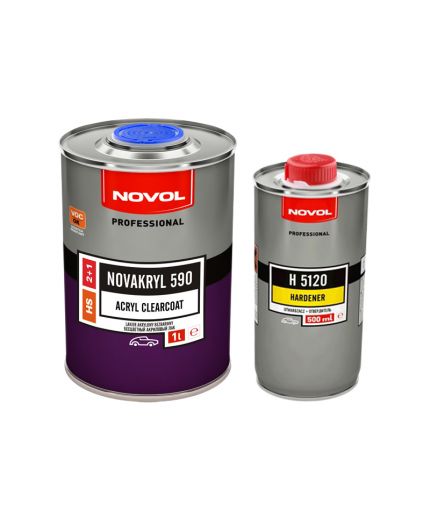 NOVOL NOVAKRYL 590 Лак акриловый HS SR 2+1 с отвердителем стандартным H5120 1,5л – бесцветный акриловый лак с большим количеством твердых частиц и повышенной стойкостью к царапинам (SR Scratch Resistant). Высокая твердость, устойчивость к UV (УФ) и атмосферным условиям гарантируют высокую прочность, а блеск и "глубина" придают отличный внешний вид лакового покрытия.