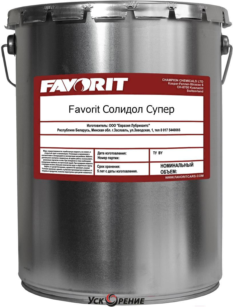 Описание Смазка Favorit Metal Солидол Супер / 54044 (18кг); Вид смазки: консистентная; Назначение: универсальная; Основа: минеральное масло