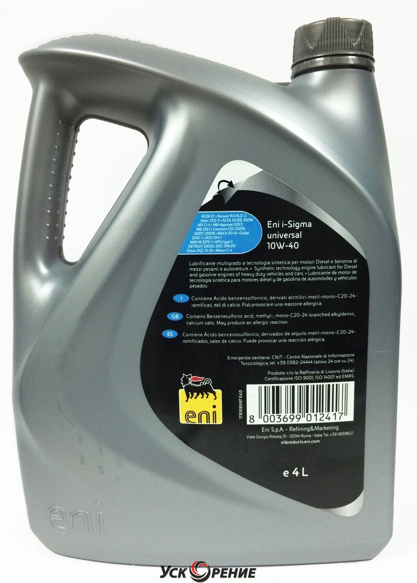 Описание Моторное масло Eni I-Sigma Universal 10W40 (4л); Состав масла: полусинтетическое; Вязкость: 10W-40; Тип двигателя: дизельный; Объём: 4 л