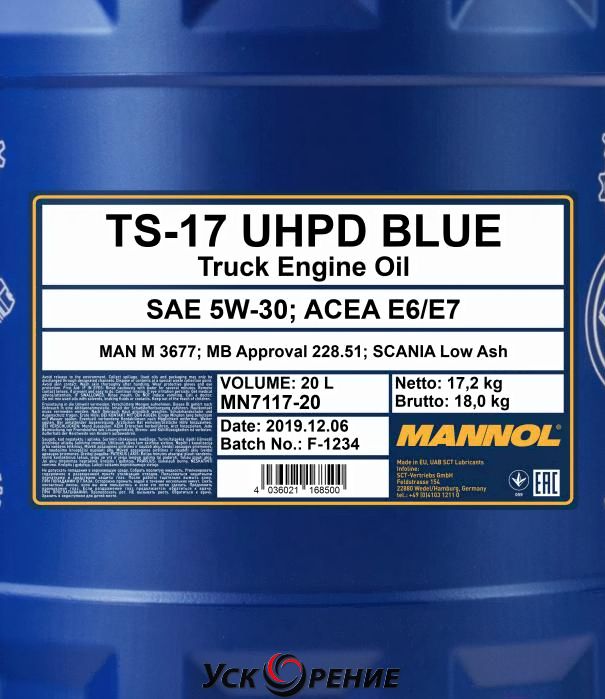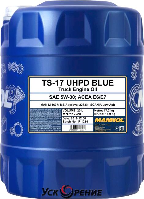Описание Моторное масло Mannol TS-17 UHPD Blue 5W30 E6/E7 / MN7117-20 (20л); Состав масла: синтетическое; Вязкость: 5W-30; Тип двигателя: дизельный; Объём: 20 л