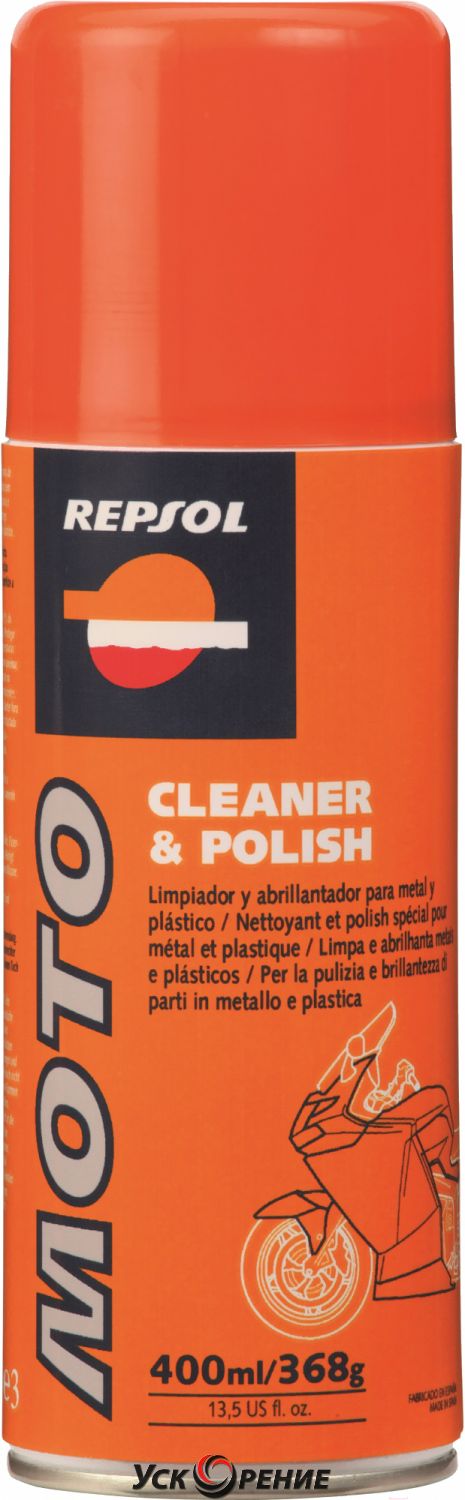 Repsol MOTO CLEANER & POLISH 400ml (спрей) - средство для очистки металлических, стекловолоконных и пластиковых деталей мотоцикла.
