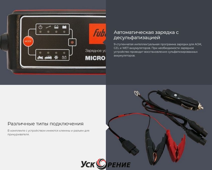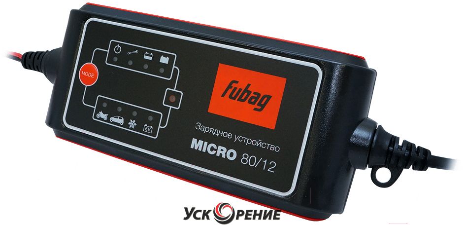 Описание Описание товара Зарядное устройство Fubag MICRO 80/12 Зарядное устройство MICRO 80/12 для зарядки всех основных типов аккумуляторов (AGM/GEM/WET) емкостью до 80 Ач. В комплекте клеммы и зажимы, разъем для прикуривателя. Смотрите также: Бензорезы , Бетоносмесители , Виброплиты , Генераторы , Комплектующие и аксессуары для строительной техники , Компрессоры , Маски сварщика , Отбойные молотки , Плиткорезы , Сварочные аппараты , Стабилизаторы , Строительные пылесосы , Тепловые пушки , Штроборезы