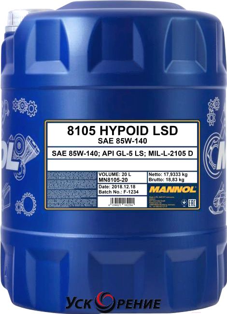 Описание Трансмиссионное масло Mannol Hypoid LSD 85W140 GL-5 / MN8105-20 (20л); Состав масла: минеральное; Вязкость: 85W-140; Объем: 20 л; Место применения: МКПП